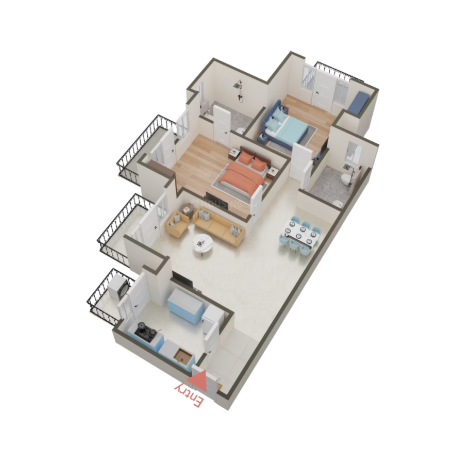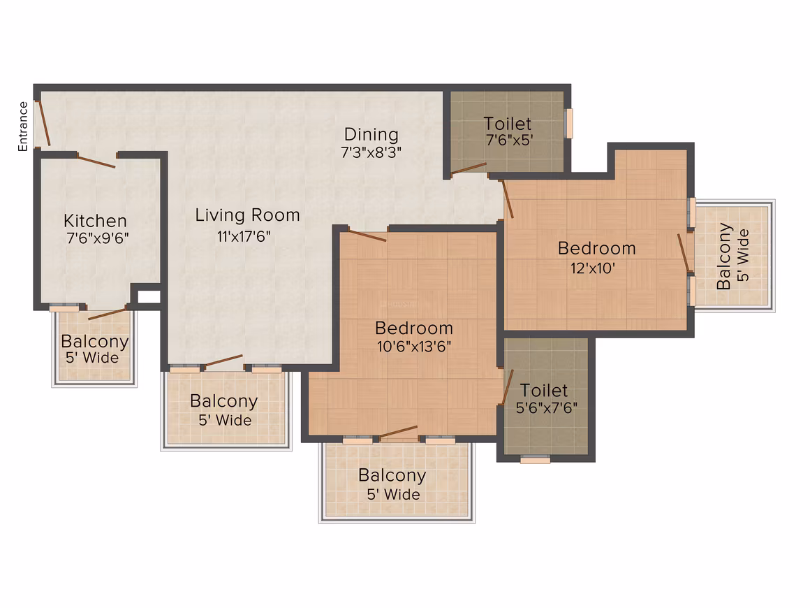 | Attached Balcony with Bedroom 2 | 5′ Wide |
